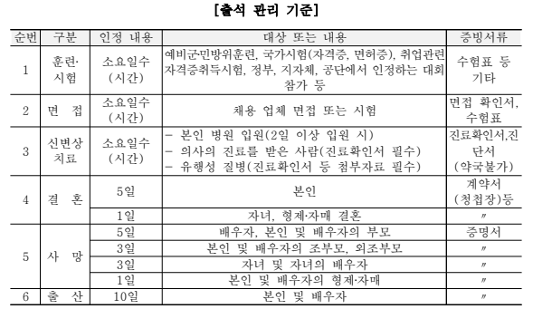 아래 사유에 해당하지 않은 휴가 = 결석으로 출석부 기재 (출석 불인정)