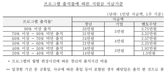 기업과 근로계약 체결한 출석"시간"기준 출석률 산정 (1주 기준 90% 이상 출석 시 수당 100% 지급)