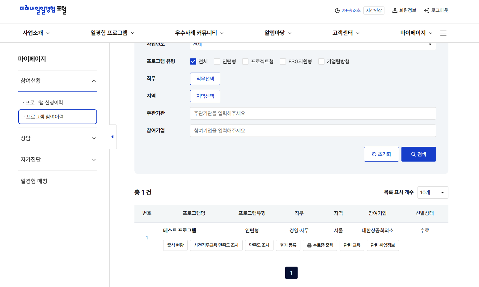 청년(미래내일)일경험포털 (yw.work24.go.kr) > 마이페이지 > 참여현황 > 프로그램 참여이력 > 만족도 조사 후 수료증 출력