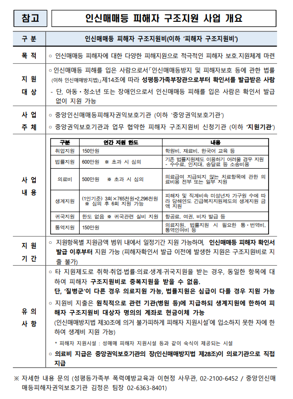 자세한 내용은 첨부된 ‘인신매매등 피해자 구조지원 사업 개요’ 자료를 참고해주시기 바랍니다.
